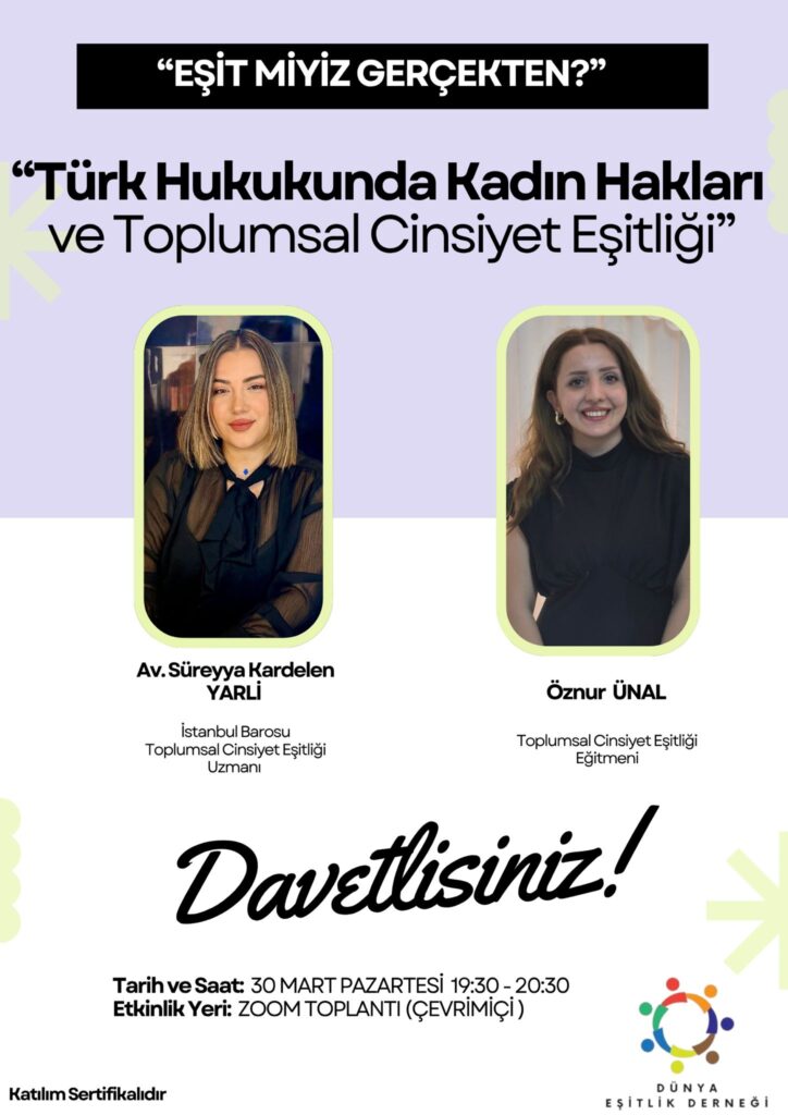 Bu oturumda, toplumsal cinsiyet eşitliği ve Türk hukukunda kadın hakları üzerine kapsamlı ve farkındalık odaklı bir webinar gerçekleştireceğiz.